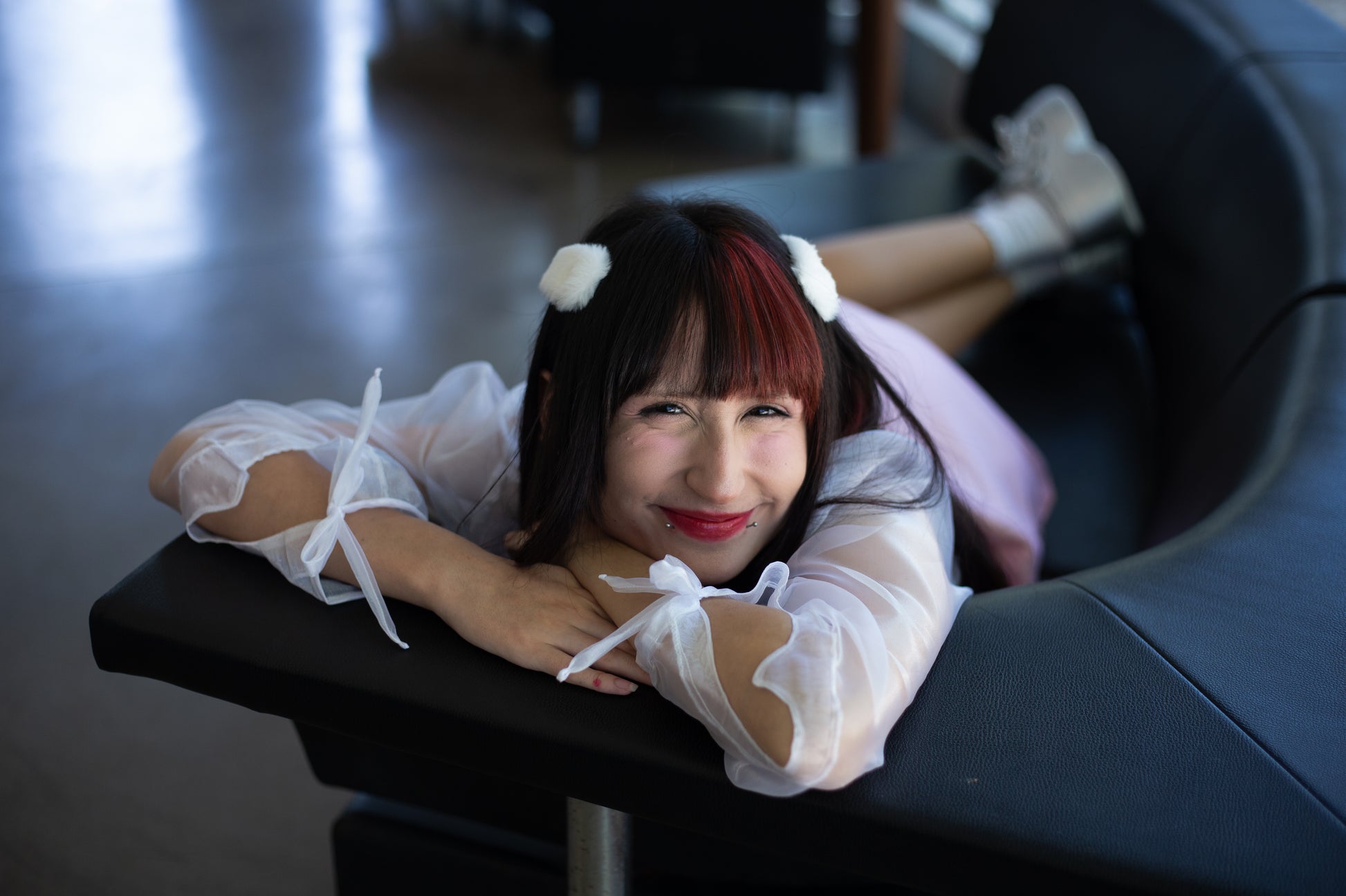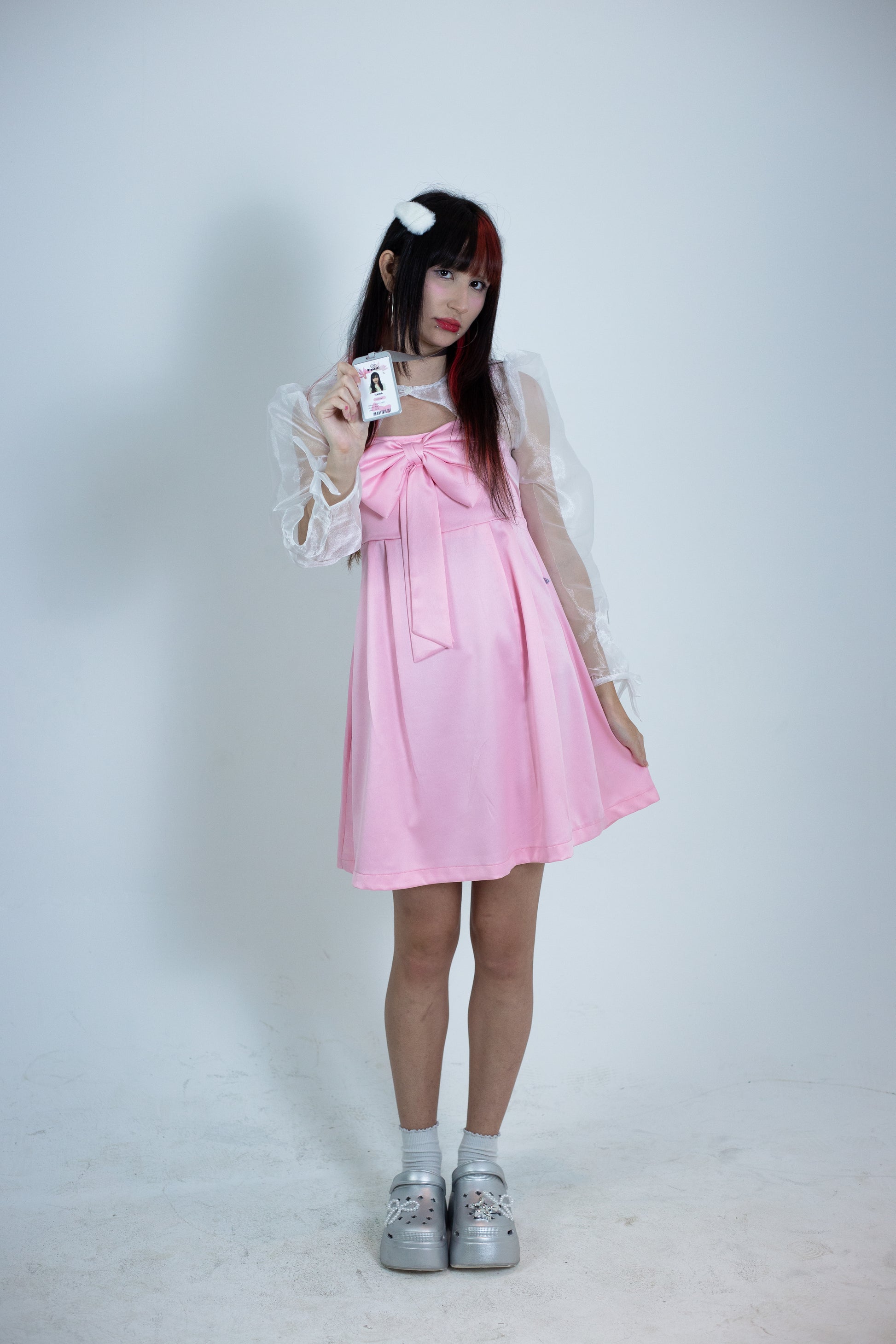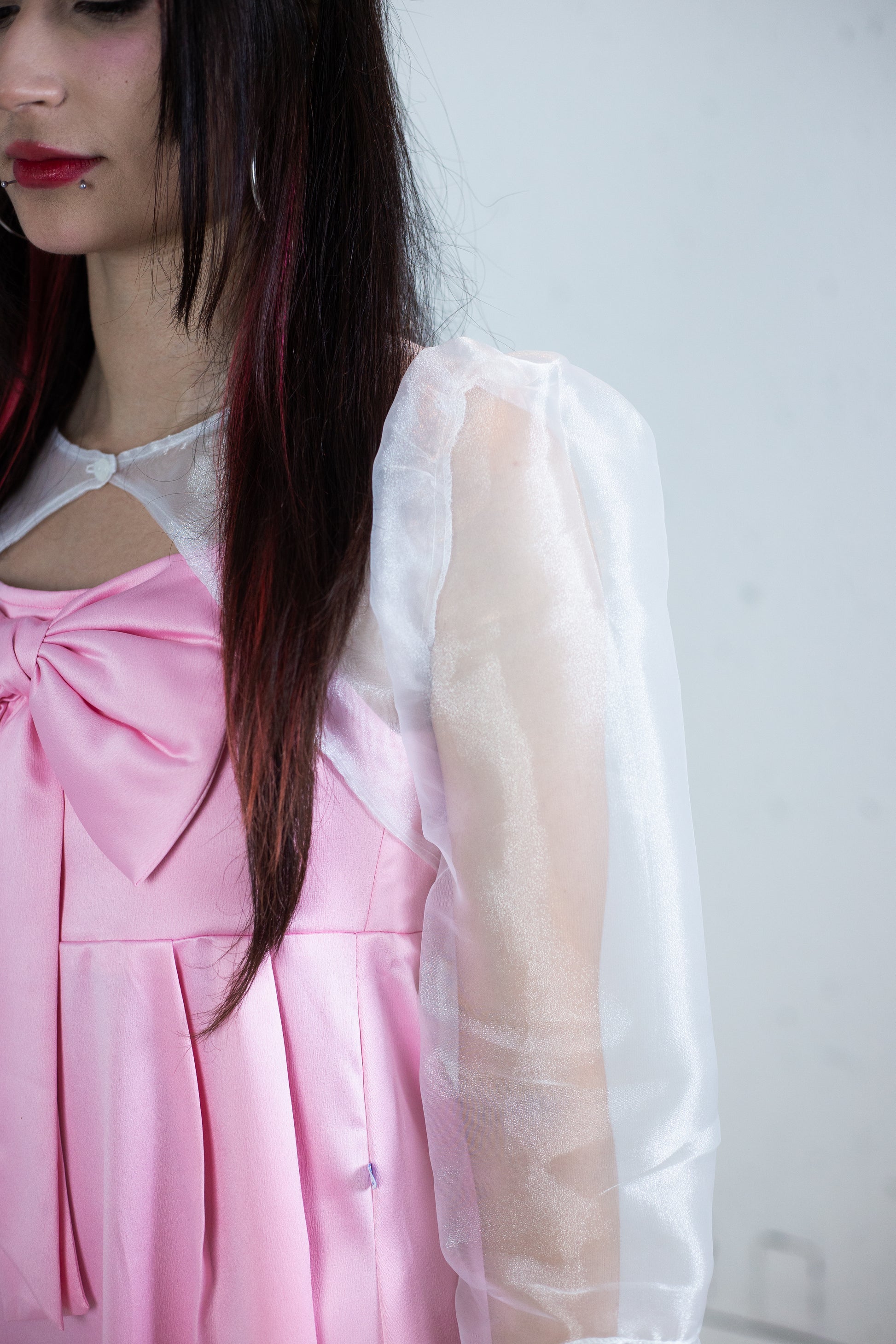Bolero curto de organza branca parcialmente transparente.